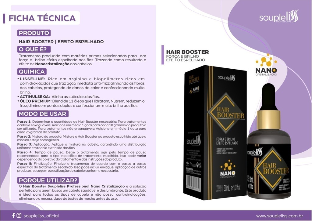 Hair Booster 30ml Nano Cristalização Soupleliss Professional O Hair Booster Soupleliss Professional Nano Cristalização é a solução perfeita para quem busca um cabelo saudável e deslumbrante. Este produto é ideal para todos os tipos de cabelo e não possui contraindicações, eliminando a necessidade de testes de mecha antes do uso. Tratamento produzido com matérias primas selecionadas para dar força e brilho efeito espelhado aos fios. Trazendo como resultado o efeito de Nanocristalização aos cabelos.