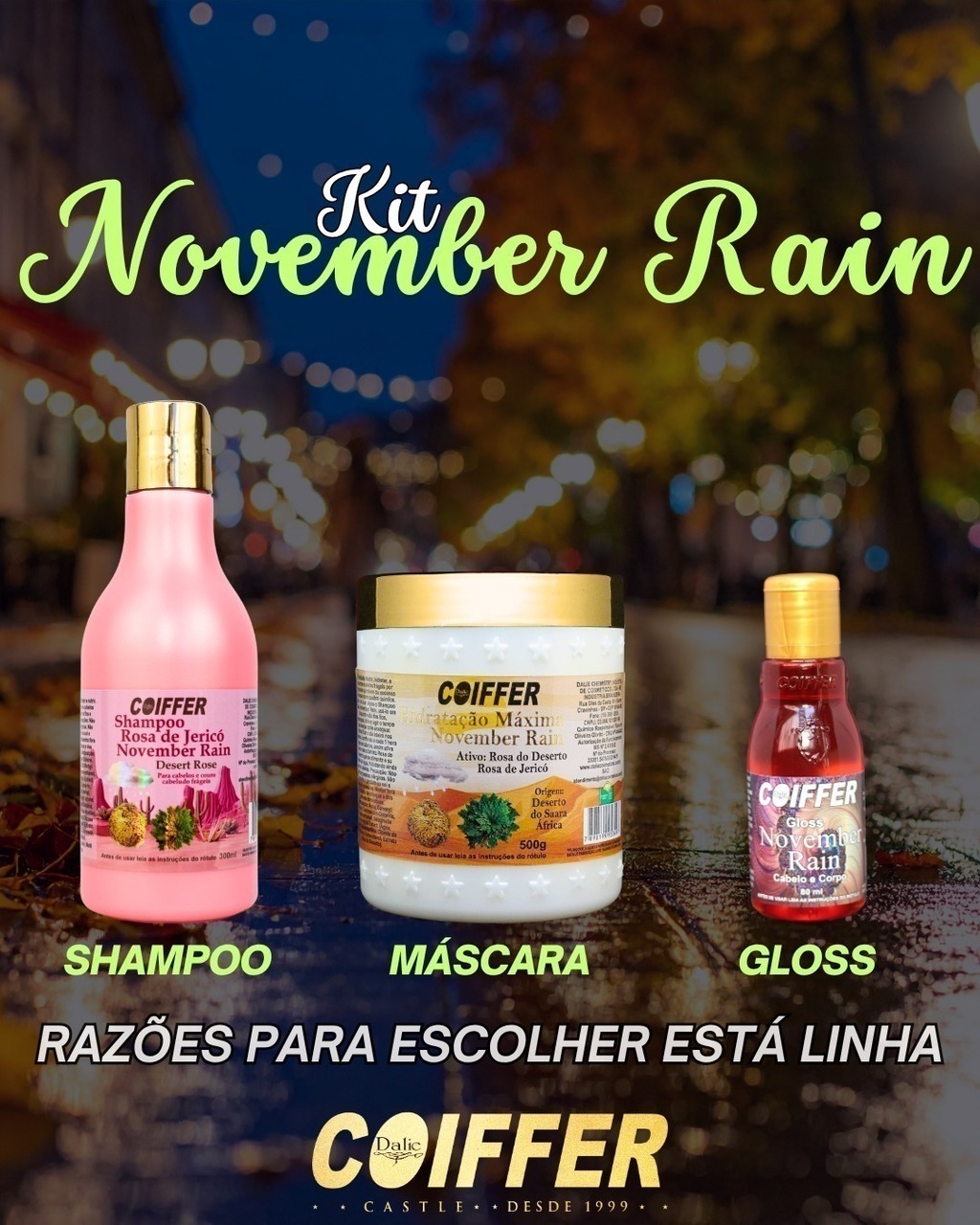 Se você busca um cabelo mais saudável e vibrante, o Kit November Rain Coiffer é a escolha certa. Desfrute de fios macios e bem cuidados, que refletem vitalidade e frescor. Traga de volta a vida aos seus cabelos e descubra a diferença que um tratamento de qualidade pode fazer no seu visual.